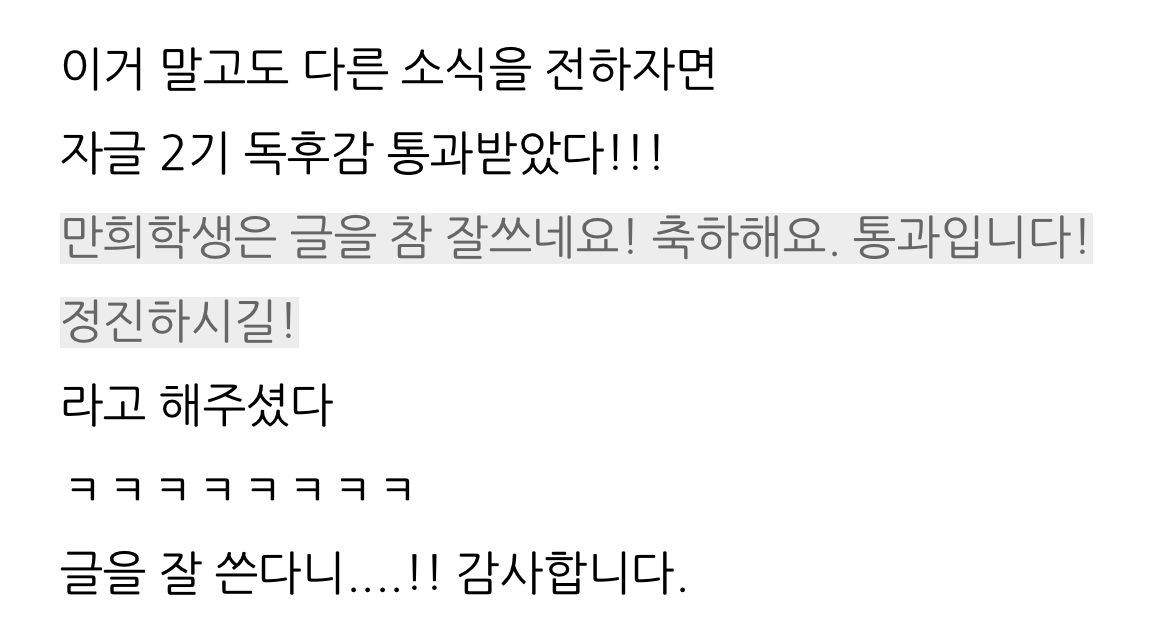 '자연계 글쓰기'라는 수업에서 글쓰기 과제 통과됐다고 좋아하는 중