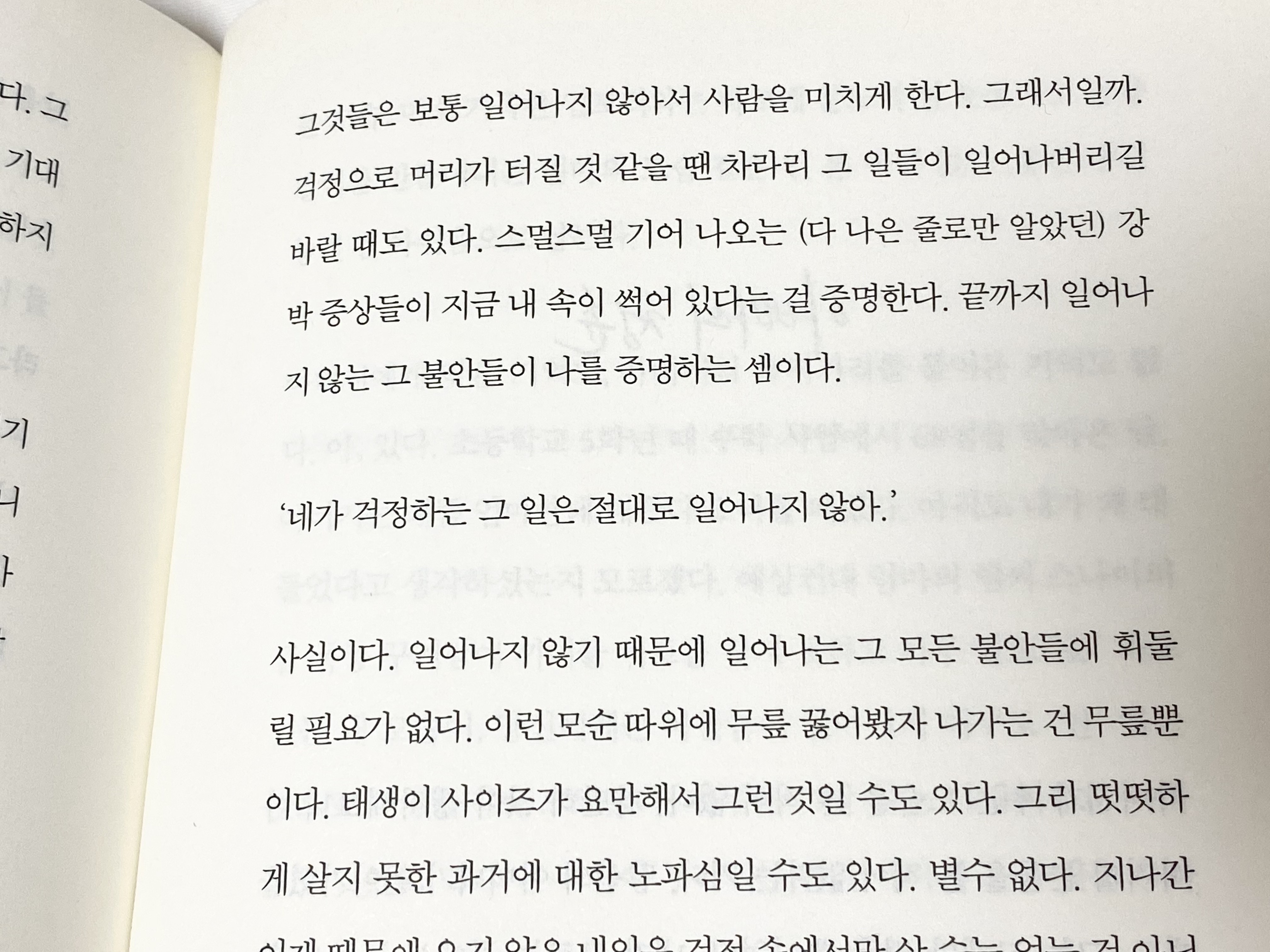 나는 한때 걱정이 정말 많았는데, 위에서 배우님이 말씀하신 것처럼 그중 대부분이 이미 일어나지 않은 일에 대한 것이었다. 내가 잘못을 저지르지도 않았는데 잘못을 저질렀을까봐, 누군가 내가 한 일을 못마땅하게 여길까봐, 내가 일을 못 한다고 생각할까봐 등등. 그래서 내가 너무 힘들어하니까 한 번은 엄마가 '근데 너한테 아무도 뭐라고 안 했잖아.'라고 했다. 내가 무언가를 잘못해서 문제가 생긴 것도 아닌데 왜 그렇게 걱정하냐고.