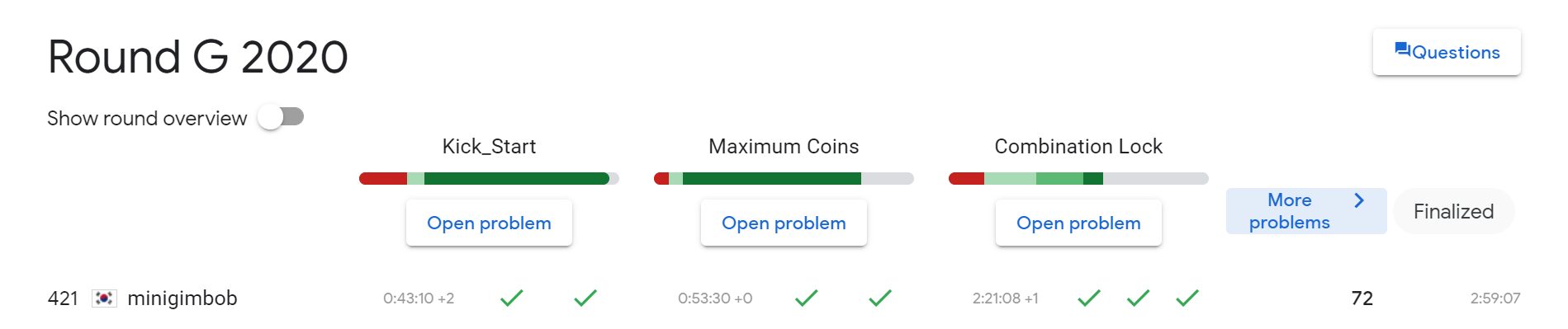 10월 9일에 2021 ICPC 인터넷 예선을 치렀다. 3솔로 최종 62등을 했다. 아쉽긴 하지만, 우리 팀은 대회를 딱히 준비하지는 않고 가벼운 마음으로 참가하려는 친구들이 모인 것이기 때문에 그런 점을 고려해보면 나쁘지 않은 것 같다. 재밌는 점은 내가 세 문제를 다 풀었다는 거다. I. Sport Climbing Combined https://www.acmicpc.net/problem/23246 23246번: Sport Climbing Combined 입력은 표준입력을 사용한다. 첫째 줄에 선수의 명수를 나타내는 양의 정수 $n$ ($3 \le n \le 100$)이 주어진다. 이어 $n$개의 줄 각각에 네 정수 $b_i$, $p_i$, $q_i$, $r_i$가 주어지는데, $b_i$는 $i$번째 ..